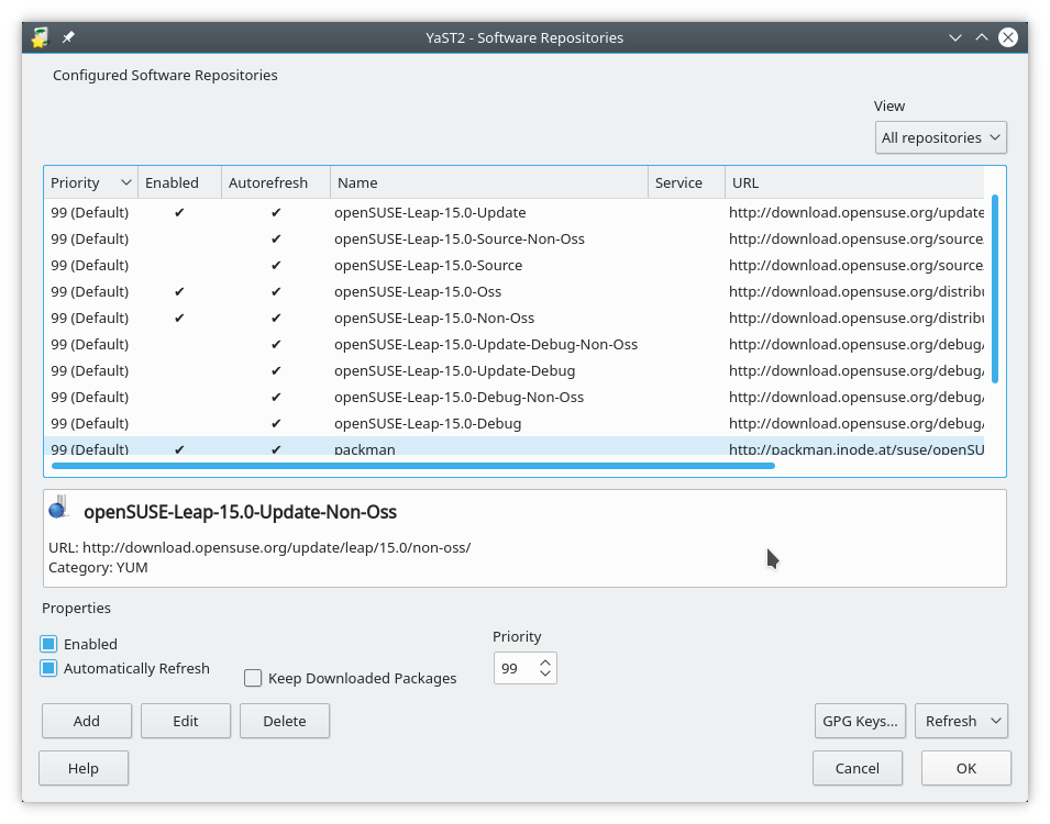 Los repositorios pueden ser añadidos, eliminados y configurados mediante YaST, en el módulo llamado Repositorios de software.