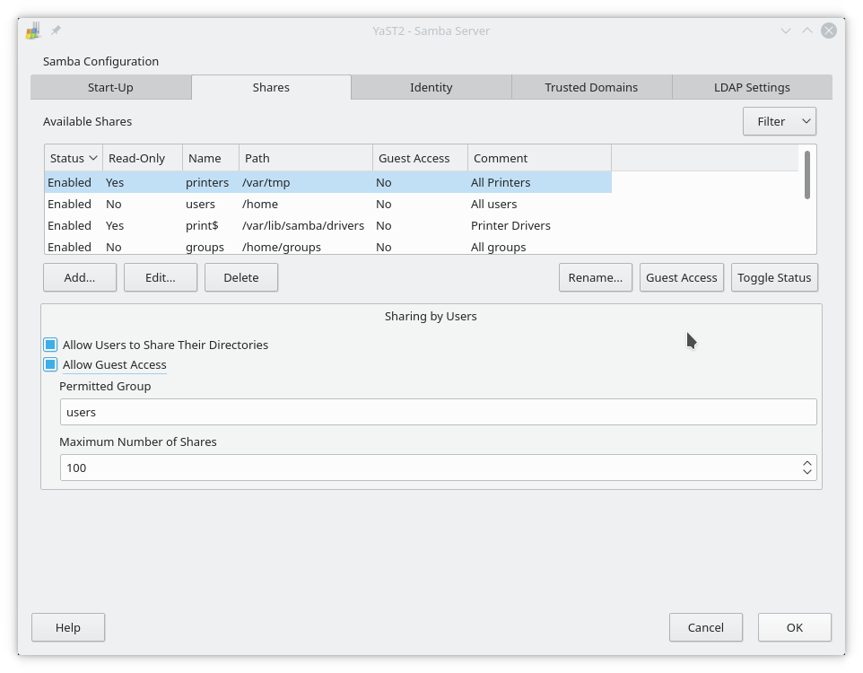 Para compartir tus archivos con los usuarios de MS Windows, Mac OSX u otros usuarios de GNU/Linux en una red local, debes configurar el servidor de Samba (asegúrate que los paquetes yast2-samba-server y samba están instalados). Sólo necesitarás realizar los primeros tres pasos la primera vez que quieras compartir una carpeta.