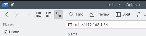 Si no conoces la dirección IP del recurso compartido, puedes navegar por la red local simplemente introduciendo smb:/ en la barra de ubicación de Dolphin. Sin embargo, esto sólo funciona si primero has configurado o inhabilitado (temporalmente) el cortafuegos. Pronto podrás leer más información al respecto